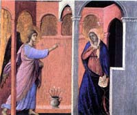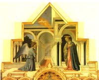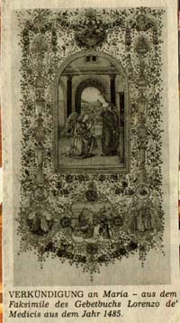 Inzwischen habe ich mir selbst hunderte von Verkündigungen angesehen, tatsächlich ist außer bei exzentrischen Versionen wie der von El Greco oder einem Meister Bertram in Hamburg, zu dem sich das womöglich noch nicht herumgesprochen hat, fast immer die Andeutung einer Säule zwischen Maria und dem Engel zu sehen, oft eigenartig maskiert, zum Beispiel als Ständer eines Blumentopfs. Worum geht es bei der Verkündigung? Eigentlich verkündet der Erzengel Gabriel Maria ja nur, daß sie den Sohn Gottes gebären wird. Da aber Jesus jungfräuliche Geburt seit dem Hochmittelater christliches Dogma ist, muß mit Sorgfalt der Eindruck vermieden werden, er könne die Frucht einer zufälligen Begegnung Marias mit einem Handlungsreisenden namens Gabriel sein - die Begegnung muß also züchtig verlaufen. Die sich in einer langen Tradition entwicklende Bildlösung bestand darin, die beiden zunächst (bei Giotto in der Srovegnikapelle und auch in unserem Beispiel dem Maestro del Bambino Vispo um 1420) in getrennten Bildern auftreten zulassen, die sich durch symmetrische Hängung aufeinander bezogen. Als später gestattet war, sie in einem Bild zu zeigen, variierte man diesen Gedanken und ließ Maria sich in einem Innenraum aufhalten, während Gabriel sich im Freien befindet (Lippi). Es waren also zwei Bilder in einem, deren Trennung voneinander ideologisch begründet war. Als die beiden sich dann in der logischen Fortsetzung dieses Gedankengangs auch in einem einzigen Raum aufhalten durften, blieb als Echo dieser Tradition in Züchtigkeit die zwischen ihnen stehende Säule übrig, die also keineswegs meinem dümmlichen Vorschlag entsprechend als Schwanz Gottes interpretiert werden darf, sondern als Instanz von Wohlanständigkeit. In diesem Sinne hatte Joa Mario tatsächlich ins Schwarze getroffen: im Film wird im Schuß-Gegenschuß-Verfahren durch den Schnitt eine ähnliche Personentrennung erzeugt, um zu verhindern, daß die Beteiligten in einem Bild zu sehen sind und in Form von Vergewaltigung, Inzest, Bruder und Vatermord übereinander herfallen können. Tatsächlich ist diese Trennung nach dem Verkündigungsmuster ja zur Methode geworden, nach der filmische Spannung erzeugt wird - sie versagt erst da, wo die Trennung endgültig aufgehoben ist, in Pornofilmen, in denen die geschlechtliche Vereinigung tatsächlich sichtbar vollzogen wird. Dort wirkt das Schuß-Gegenschuß-Verfahren lächerlich, absurd und obsolet. In Verbindung mit Pornographie ist vielleicht interessant, daß die erste von mir gefundene Verkündigung ohne dazwischenstehende Säule aus dem Gebetbuch des