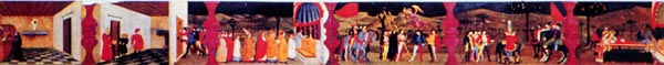 vor allem Landkarten des Inneren, des Bewußtseins. In diesem Sinne wäre das Rechteck eine Art Behälter dieses Bewußtseins. Wir sahen uns die Reproduktionen an, die ich aus Urbino mitgebracht hatte. Auf Ucellos "Schändung der Hostie" aus dem Jahre 1450 überraschten uns